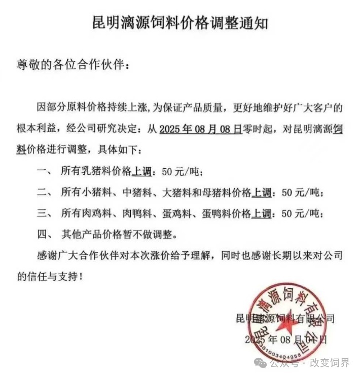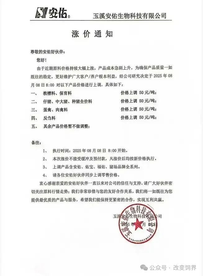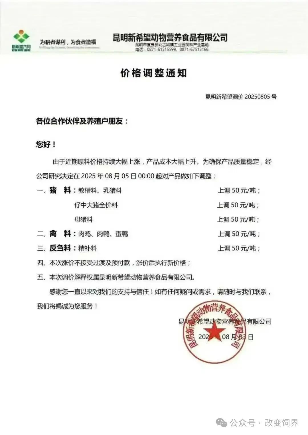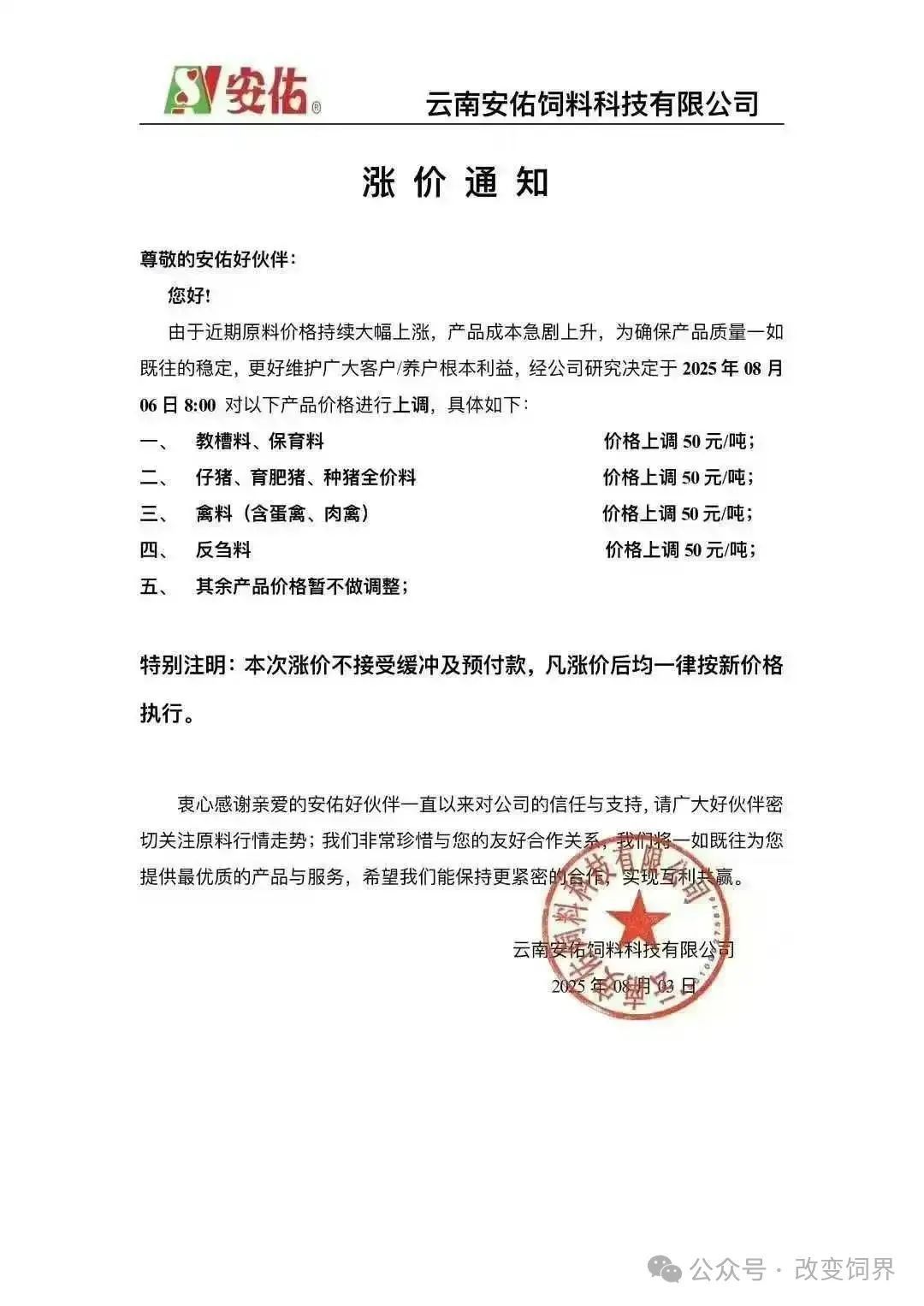 8月5~8日,新希望、安佑、海大、漓源、特驱、云中美农牧、利之源等纷纷宣布饲料涨价50元/吨。