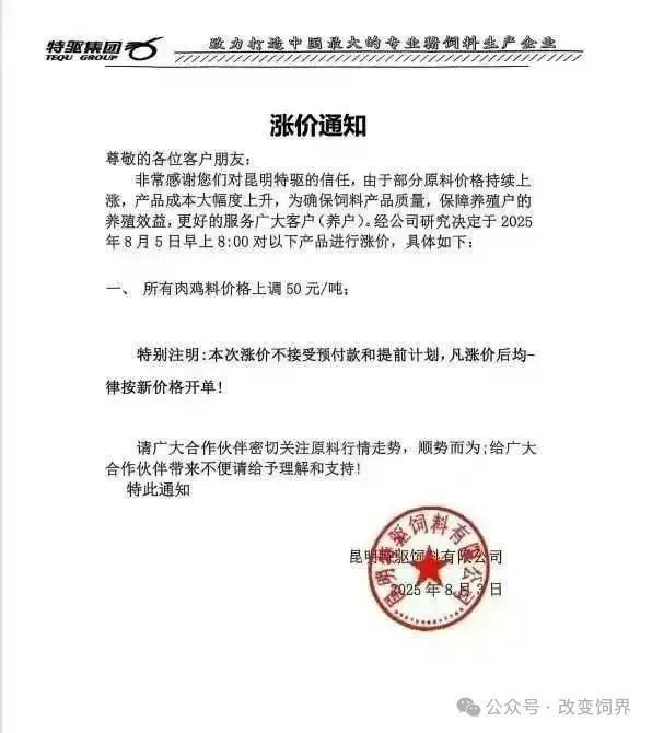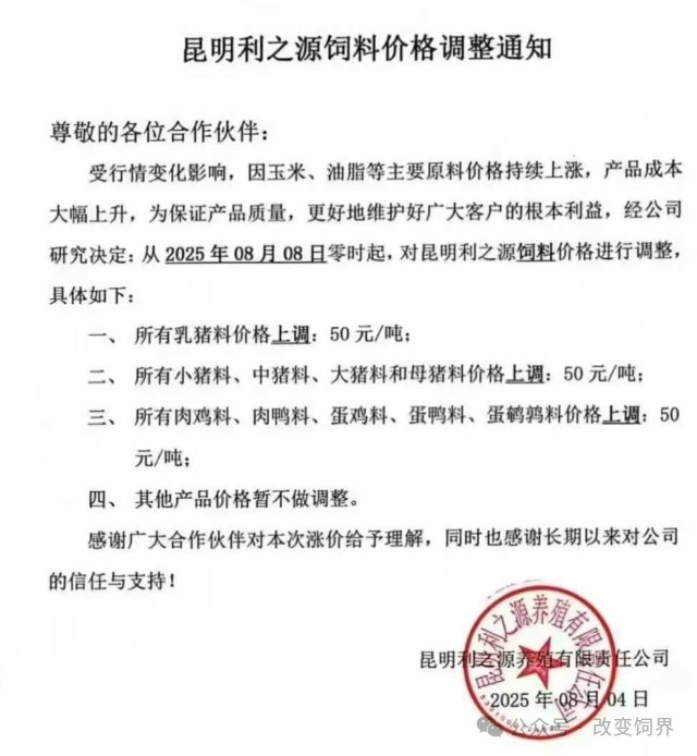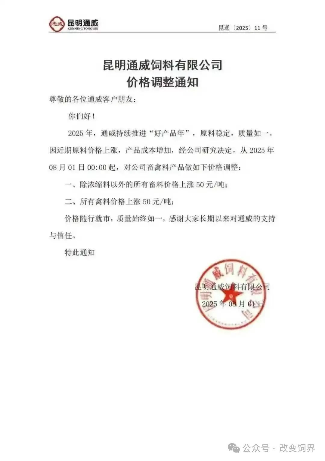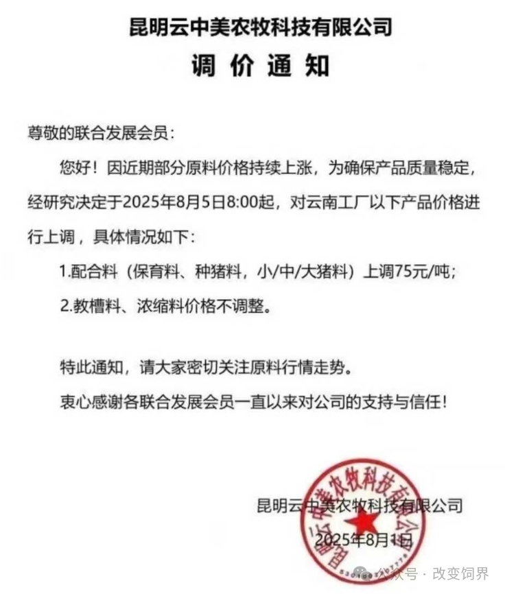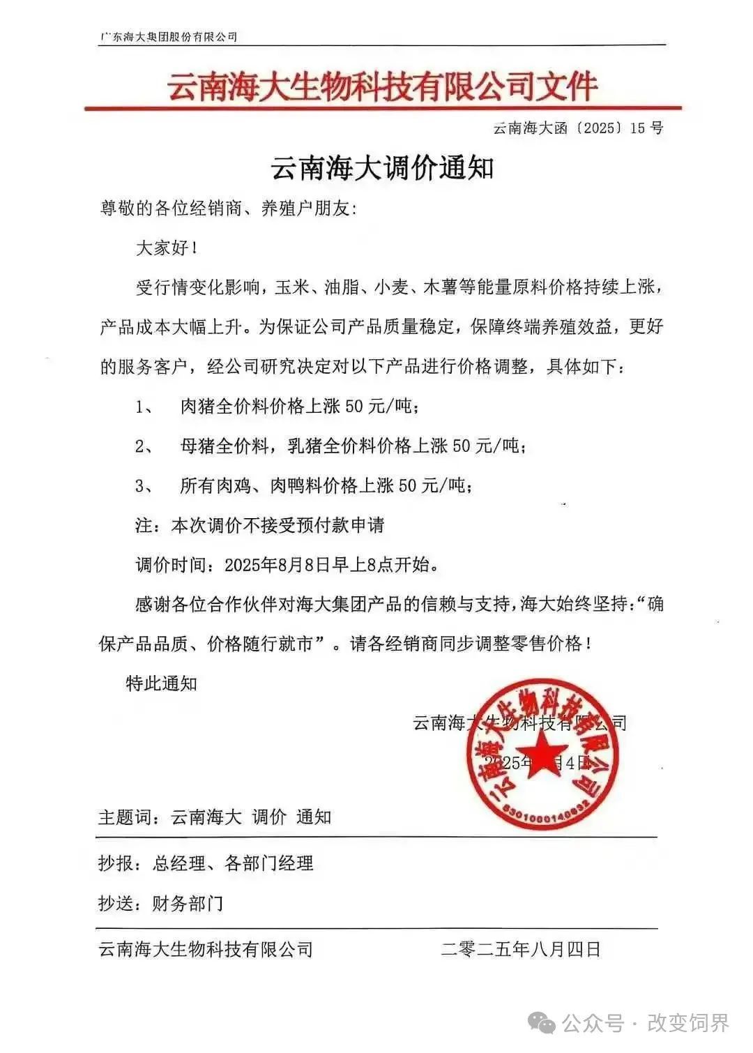 8月5~8日,新希望、安佑、海大、漓源、特驱、云中美农牧、利之源等纷纷宣布饲料涨价50元/吨。